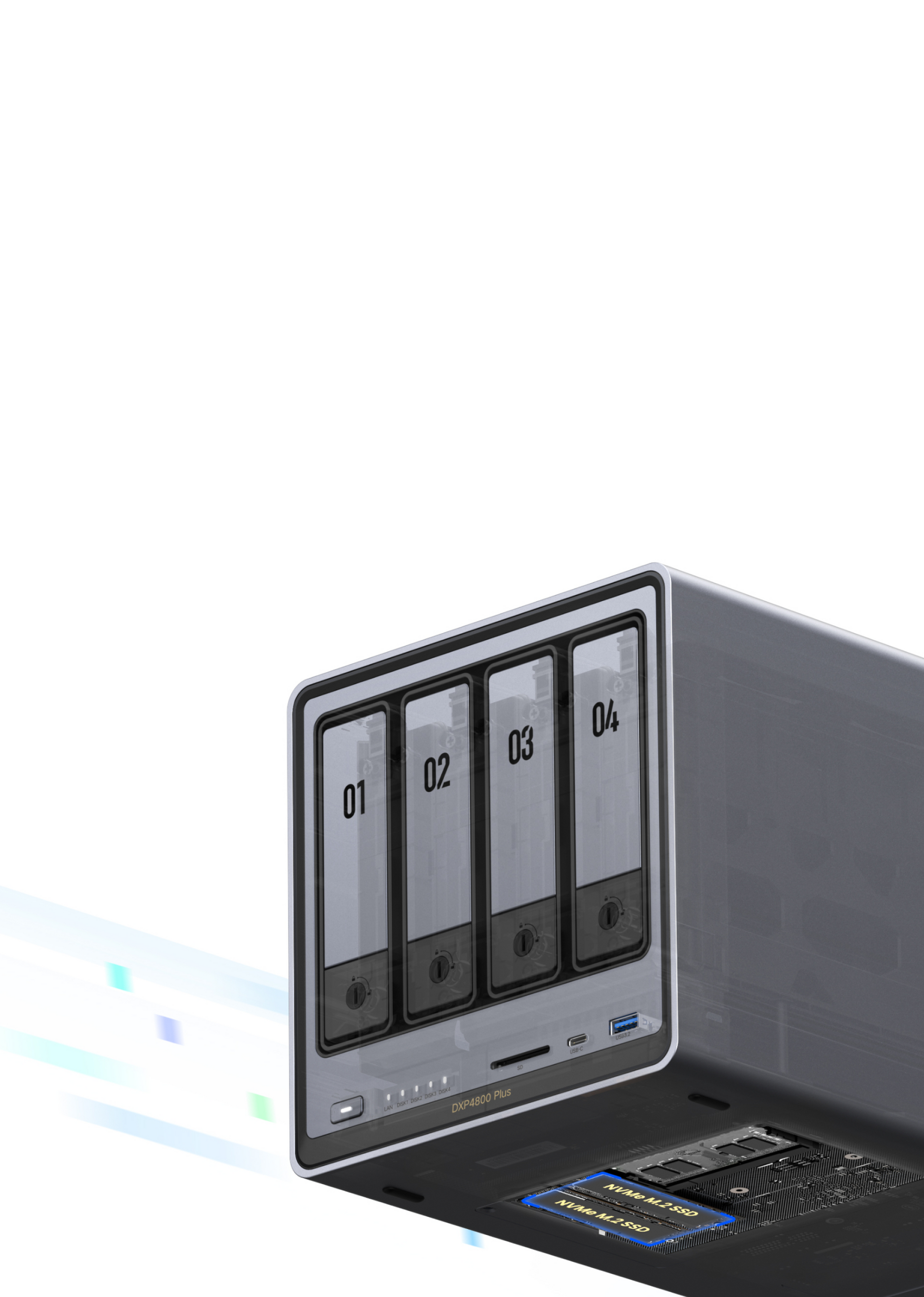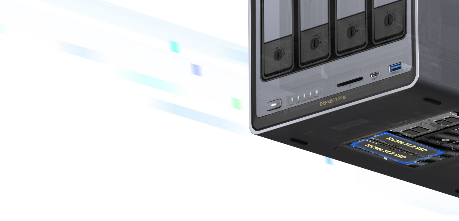 Yes. The DXP4800 Plus features expandable DDR5 RAM (8GB base, upgradable to 64GB) and includes two M.2 NVMe slots for adding high-speed SSDs to accelerate storage performance.