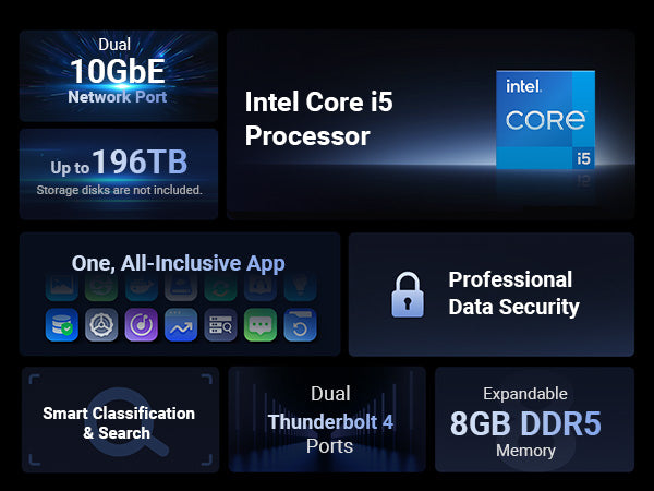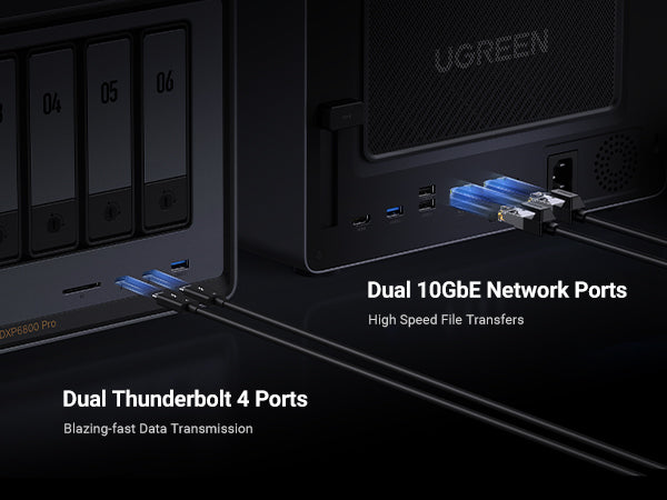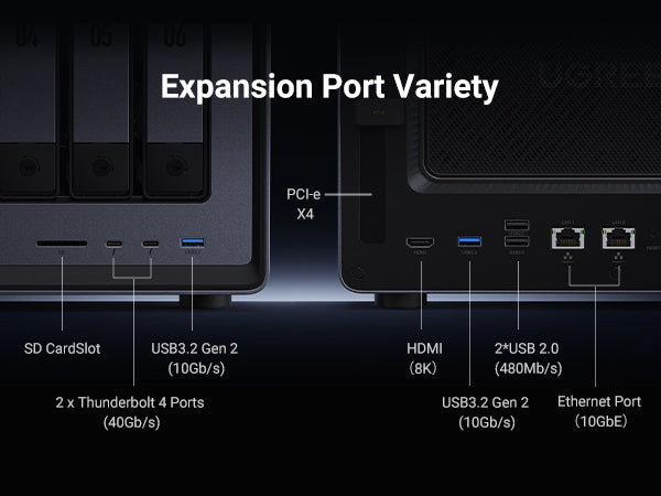UGREEN NASync offers a powerful NAS storage solution with nearly 256TB of space*, 64GB of expandable memory, and a 10GbE Ethernet port, perfect for high-speed data transfers and 8K video outputs. This system is ideal for home NAS storage and professional use alike.