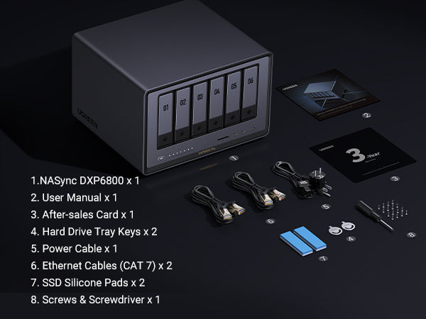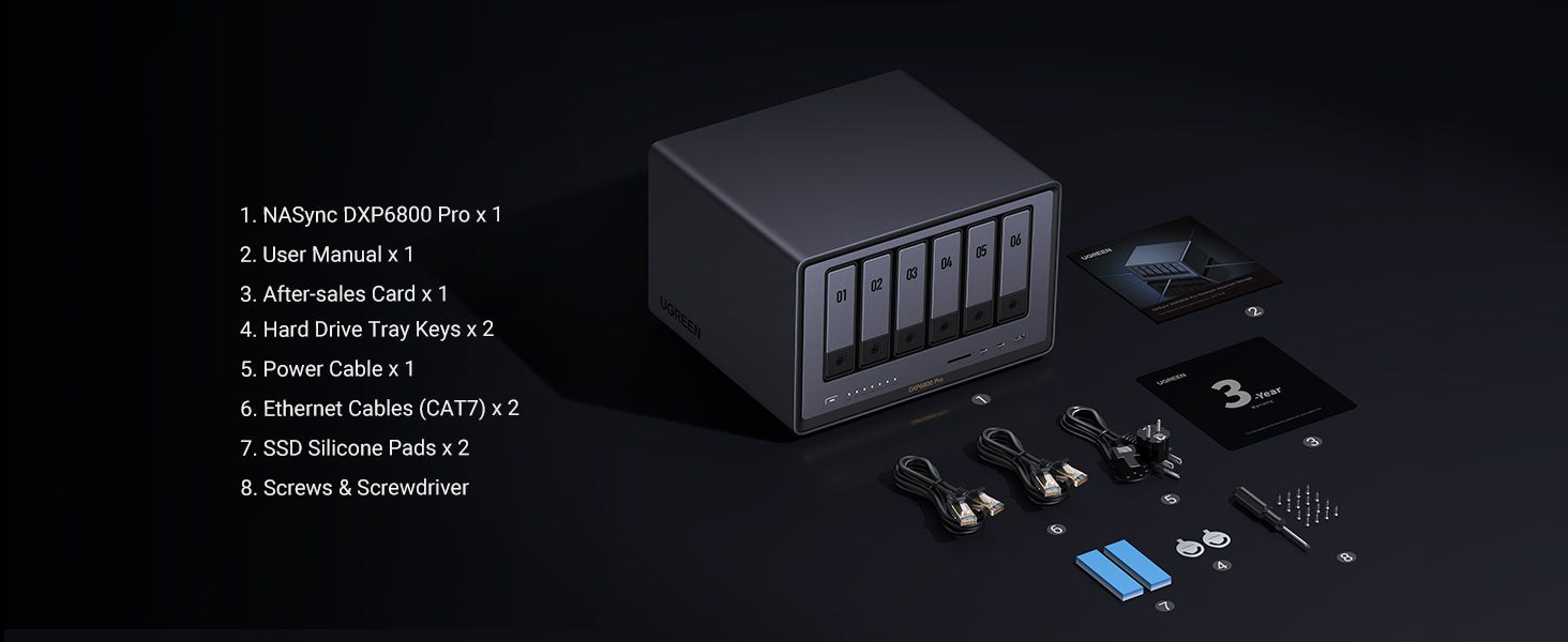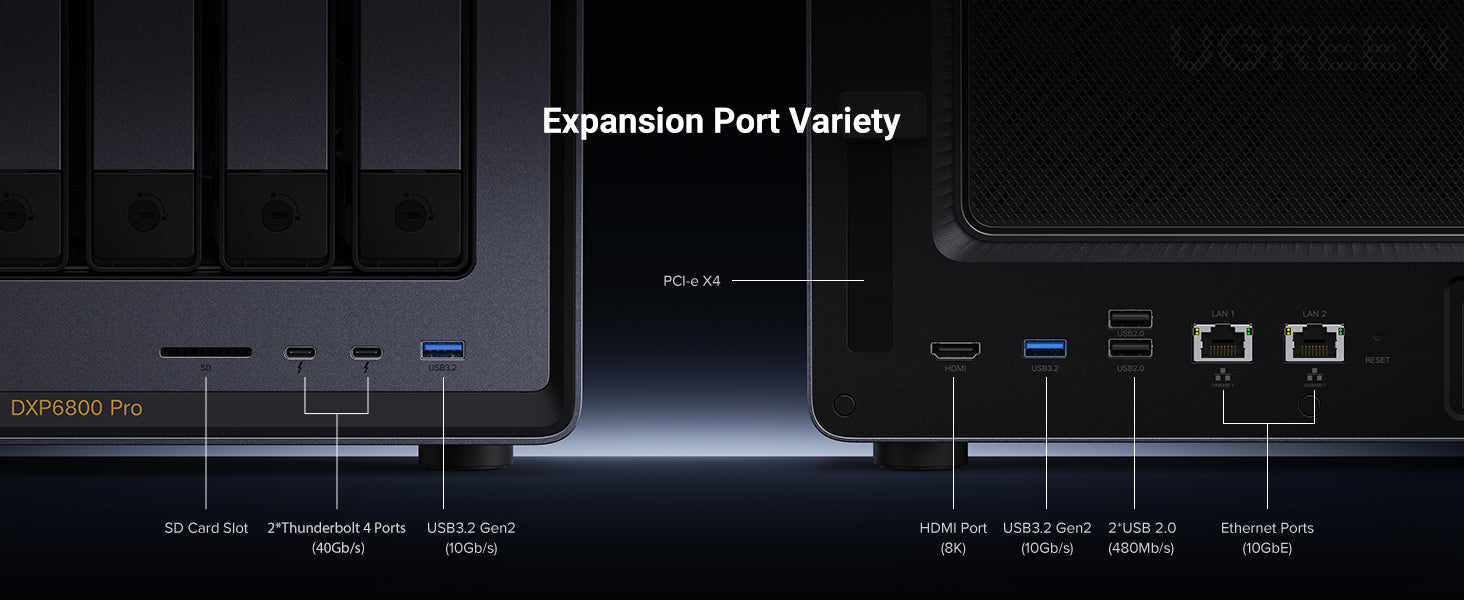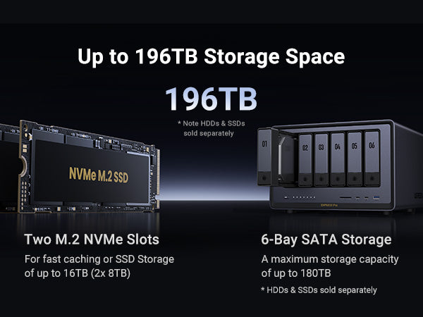- 6-Bay, 196TB Massive Data Storage: Equipped with six SATA and two M.2 NVMe drive bays, the NASync DXP6800 Pro has a maximum storage capacity of up to 196TB. And supports JBOD/Basic/RAID0/RAID1/RAID5/RAID6/RAID10 RAID levels. Store thousands of HD movies, pictures, and documents, Making NASync a movie library, photo album, and file storage space all in one.