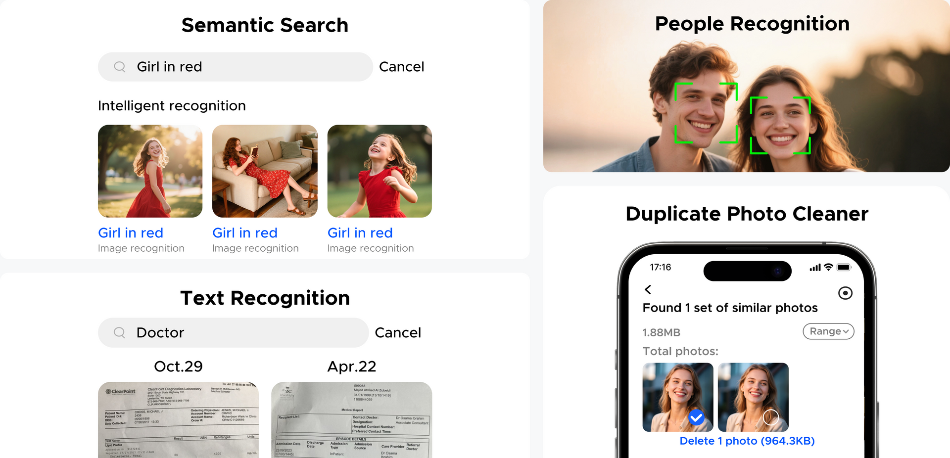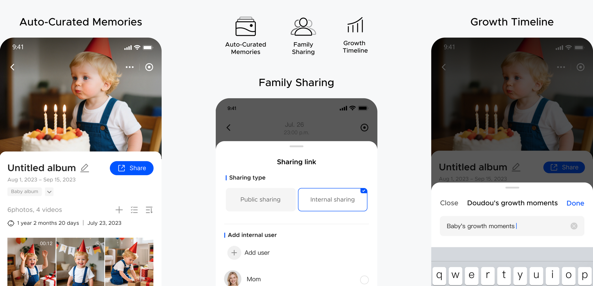- The AI automatically organizes: photos by faces, scenes, and places, removes duplicates, and creates personalized baby growth albums – effortlessly preserving all precious moments and enabling easy sharing with family via QR code or link.