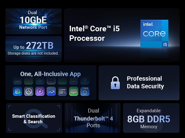 As the flagship model of the DXP series, it combines 8 drive bays with M.2 NVMe support, dual 10GbE networking, Thunderbolt 4 connectivity, a high-performance Intel Core processor, and full support for virtual machines and Docker. This combination allows the DXP8800 Plus to serve as an all-in-one solution for large media libraries, high-speed editing workflows, virtualization, and collaborative use—capabilities that entry-level NAS models cannot provide.