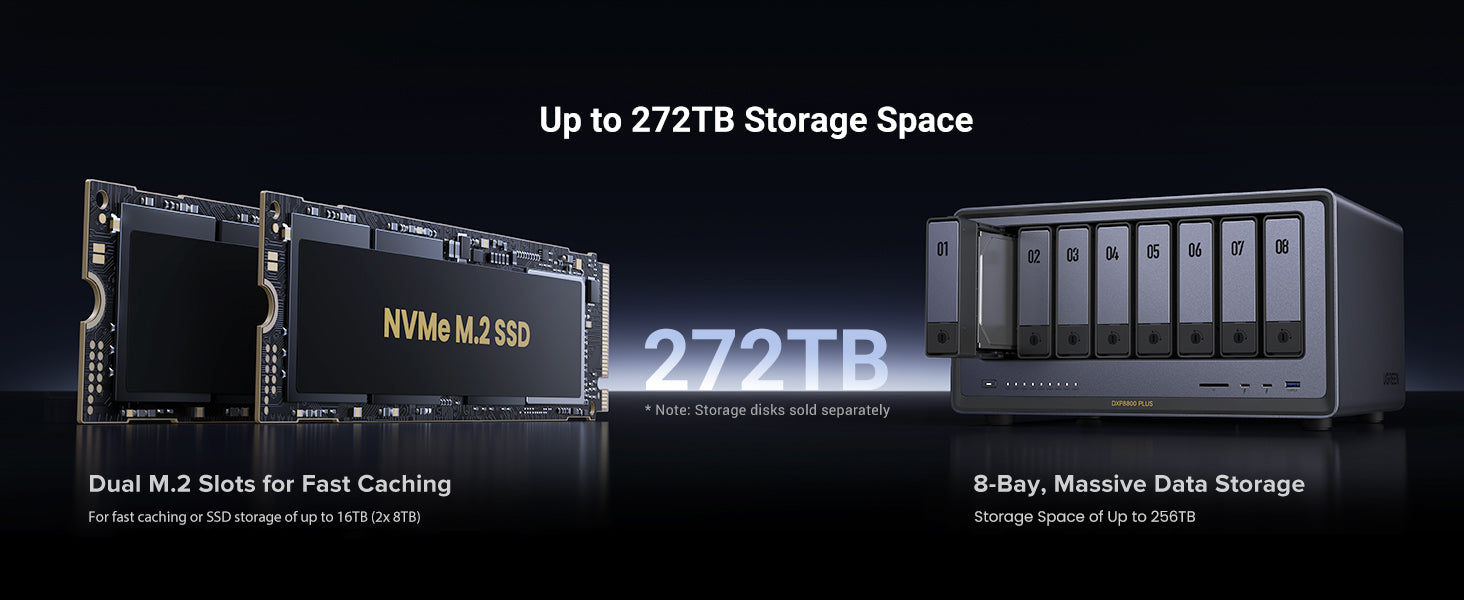 UGREEN NASync offers a powerful NAS storage solution with nearly 272TB of space*, 64GB of expandable memory, and a 10GbE Ethernet port, perfect for high-speed data transfers and 8K video outputs. This system is ideal for home NAS storage and professional use alike.